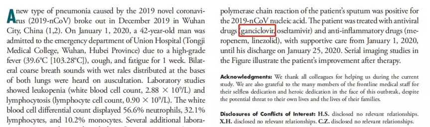 武漢同濟醫院專家在《Radiology》上發表的研究提到,142歲的患者在202011日住院,在此期間接受更昔洛韋、奧司他韋以及其他抗菌藥物治療,最終于2020125日治愈出院。